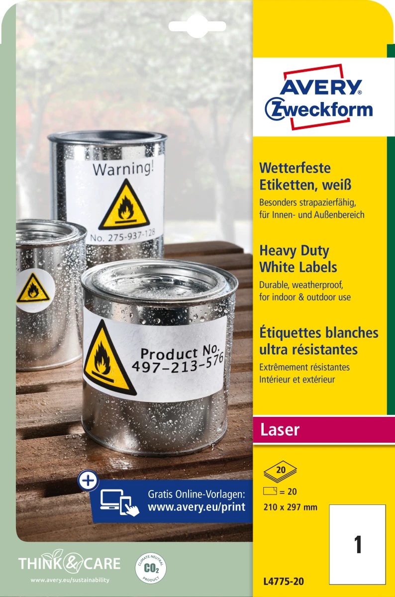 Produktinformationen "AZ Folien-Etiketten L4775-20 weiß wetterfeste Folie Inh.20 210 x 297 mm Avery Zweckform"