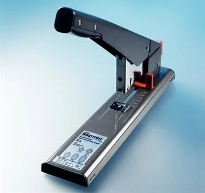 Solider Blockhefter aus Metall, der Papierstapel bis zu 24 mm Dicke heftet. 5Klammernlängen ermöglichen ein Heften von 50 bis ca 150 Blatt. Einlegetiefe 70 mm. Lieferung ohne Heftklammern.