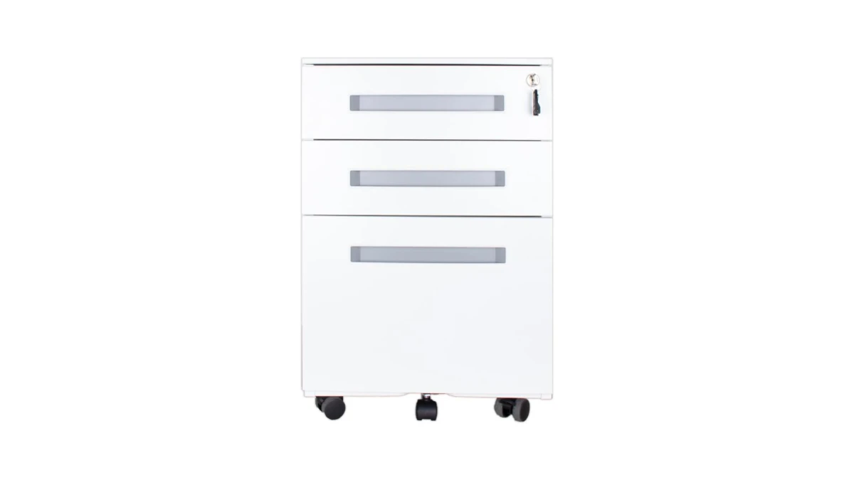 Unser Rollkorpus mit vier Rädern, in der Farbe weiss, bietet Ihnen drei Schubladen mit viel Stauraum, die unterste Schublade eignet sich für Hängeregister. Zudem lassen sich alle drei Schubladen abschliessen.