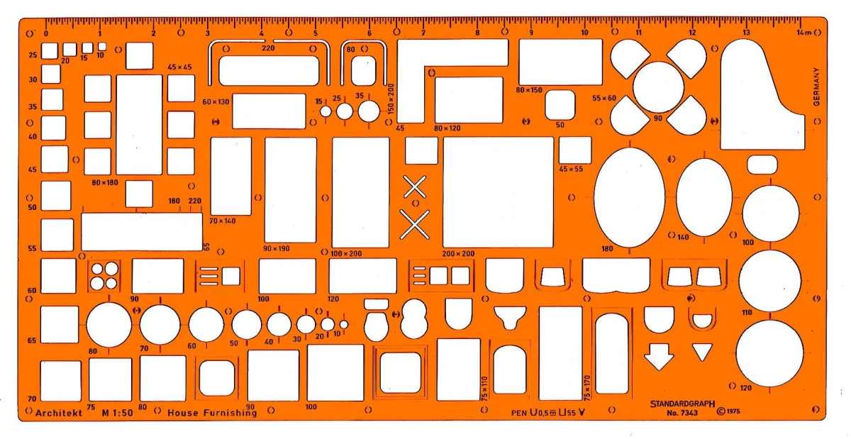 Die Möblierungsschablone «Architekt» eignet sich ideal für das Erstellen von Einrichtungsplänen im Wohn-, Schlaf-, Küchenbereich und sanitären Anlagen.