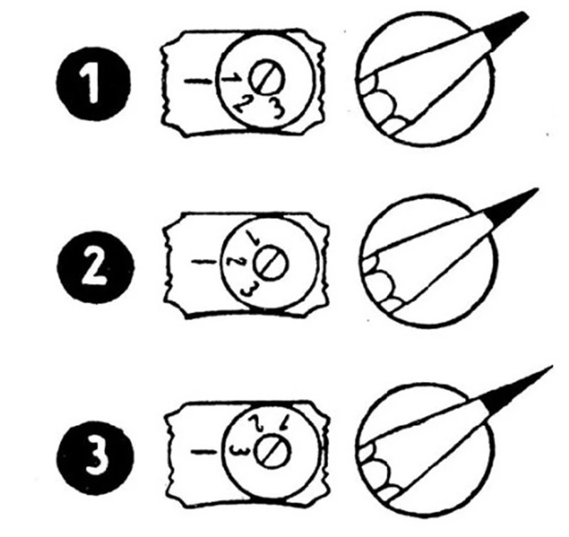 - Drei verschiedene Einstellungen: 1. leicht abgestumpfte Spitze für Farbstifte / 2. normale Spitze für Bleistifte / 3. feinste, punktgenaue Spitze für Zeichenstifte