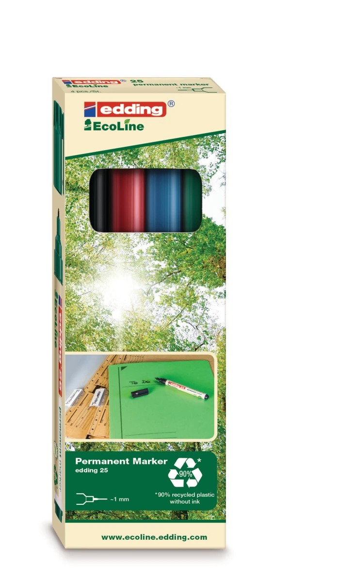 Der feinschreibende edding 25 überzeugt durch sein umweltfreundliches Material. Wie alle Permanentmarker der edding EcoLine besteht er überwiegend aus recyceltem post-consumer Material. Dank seiner lichtbeständigen und abriebfesten Tinte eignet er sich hervorragend für den Einsatz auf fast allen Oberflächen. Selbstverständlich in der gleichen Qualität wie die vergleichbaren Permanentmarker aus dem edding Standardsortiment.