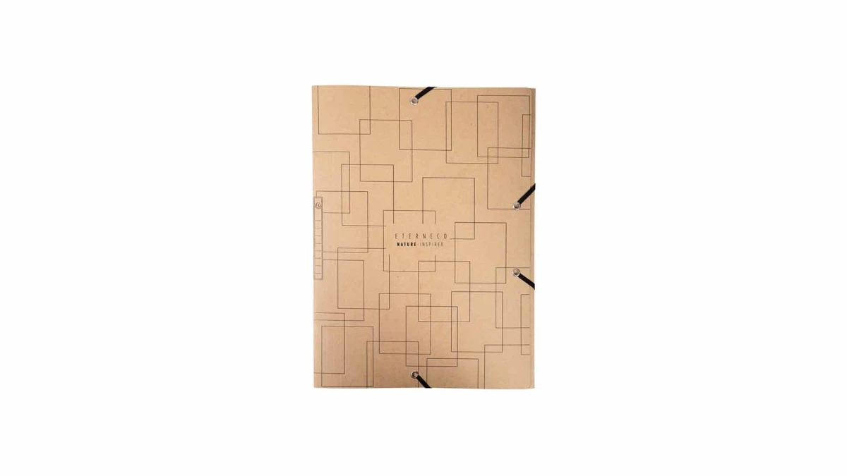 Der Einband dieser Sammelmappe mit Gummizug ist aus einem Karton aus Neufasern und Papierresten. Der Karton ist mit einer pflanzlichen Ölschicht beschichtet, durch die der Karton wasserfest wird. Die Sammelmappe ist somit widerstandsfähig, langlebig und leicht zu recyceln. Sie ersetzt mühelos Hüllen aus Kunststoff, da sie ökologischer ist.