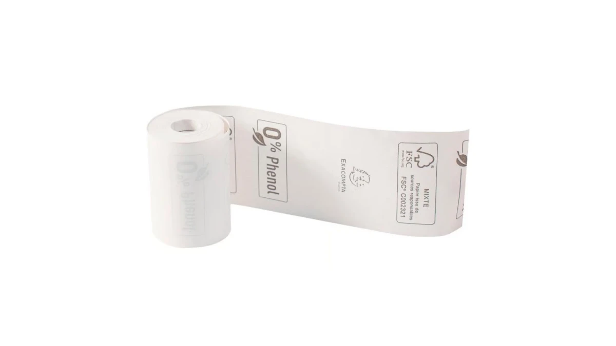 Das Papier ist garantiert frei von Phenol, d.h. ohne Bisphenol A, und auch ohne Bisphenol S, also ohne chemische Entwickler. Die Angabe "0% Phenol", das FSC-Logo und das Exacompta-Logo sind auf der Rückseite des Papiers gedruckt.