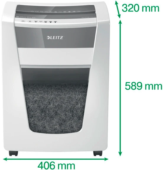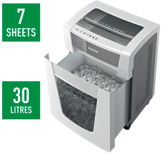 Der Aktenvernichter Leitz IQ Office Pro Sicherheitsstufe P5+ (3 mal sicherer als P-5 Standard) ist nicht nur äusserst schick, sondern arbeitet auch extrem leise, sodass der Schredder selbst in grösseren Büros nicht stört. Dieser Aktenvernichter kann 4 Stunden im Dauerbetrieb eingesetzt werden und ist dank Touch Control und Anti-Papierstau-Technologie leicht zu bedienen. Die Sicherheitsstufe P5+ bietet höchste Sicherheit auch bei sensiblen Daten. 7 DIN-A4-Seiten können auf einmal geschreddert werden; der grosszügige Auffangbehälter umfasst 30 Liter.