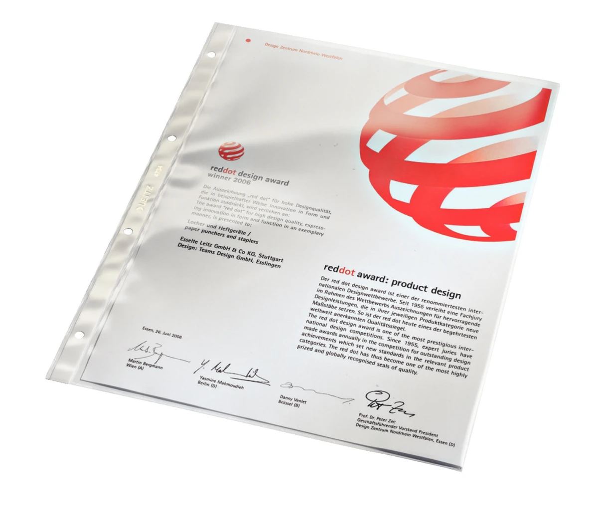 Bei der Herstellung der Zeigetasche der Marke Leitz wurde PVC glanz/lisse eingesetzt. Konzipiert für Standard-Dokumente im A4-Format finden hier alle Ihre Dokumente ihren Platz.