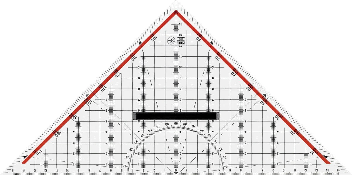 Geometriedreieck mit gegenläufiger Grad-Skala, rot hinterlegt, Acrylglas, abnehmbarer Griff, im Etui.