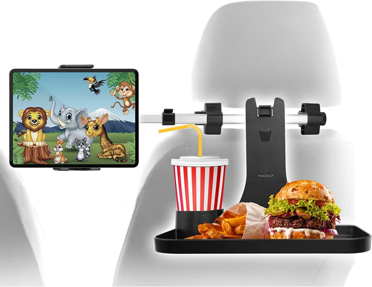 Mit der Kopfstützenhalterung des Macally HRMOUNTPROTRAY-Autositzes können Passagiere Filme bequem auf dem iPad / Tablet von der Rückbank aus ansehen. Die Kopfstützenhalterung kann einfach und sicher an den vorderen Kopfstützenstützen des Autos mit einer Breite von 5,1 cm bis 18,4 cm befestigt werden. Die Halterung ist für iPad / Tablet und andere mobile Geräte mit einer Breite oder Länge von 11,5 cm bis 23,5 cm geeignet. Der robuste Aluminiumrahmen kann verlängert werden, sodass der Halter auch in der Mitte zwischen den beiden Vordersitzen platziert werden kann, sodass alle Passagiere gleichzeitig denselben Film genießen können. Die Wiege ist voll einstellbar und kann zwischen Hoch- und Querformat gedreht werden. Kann leicht nach oben geklappt und verriegelt werden, damit die Ablage bei nichtbenutzung nicht im Wege ist. Die 31.5cm x 14.2cm breite Tischablage mit erhöhtem Rand und einem 7.6cm breiten Getränkehalter (6.3cm tief), eignet sich ideal um Getränke und Speisen sicher am Platz zu halten.