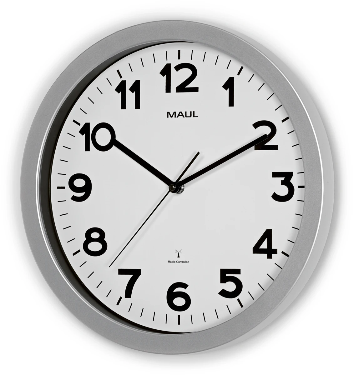 Standardmodell in ansprechendem Design. Funkuhr. Moderner Rahmen aus bruchfestem Kunststoff in Silber. Schrift besonders gut lesbar. Dezente Optik für Büroräume oder zu Hause. Abdeckung aus flachem Mineralglas.