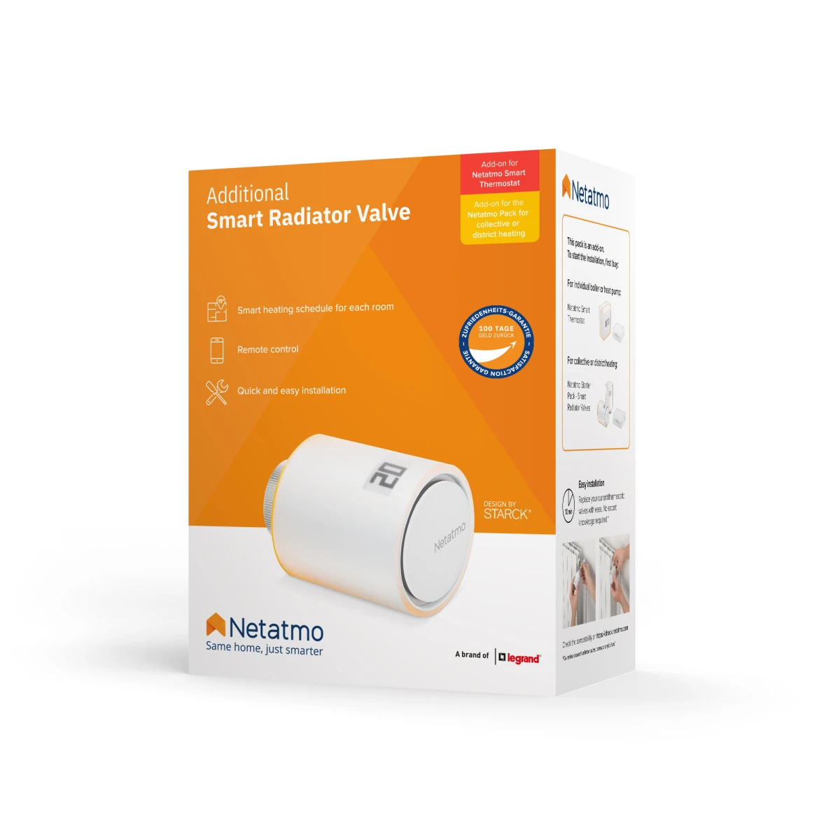 HIGHLIGHTS• Als echtes Zubehör zu dem Smarten Thermostat und dem Starterpaket für Sammelheizungen gibt es Zusätzliche Smarte Heizkörperthermostate, über die Sie die Temperatur in Ihrer Wohnung noch präziser steuern können. Bestimmen Sie selbst die Temperatur in jedem Raum.• Noch mehr Energie sparen Sie mit der Fenster-Offen-Erkennung, die automatisch die Heizkörper in einem Raum ausstellt.• Etwas Unvorhergesehenes passiert? Programmieren Sie Ihre Heizung neu, direkt vom Smartphone, Tablet oder Computer aus. Und dank der Kompatibilität mit dem Apple HomeKit, Alexa und dem Google Assistant verfügen Ihre Smarten Heizkörperthermostate über Sprachsteuerung.• Laut der Mehrheit unserer Nutzer werden pro Jahr bis zu 250 CHF an Kosten gespart.• Netatmo ist seit 10 Jahren im Dienst Ihrer Energieeinsparungen.