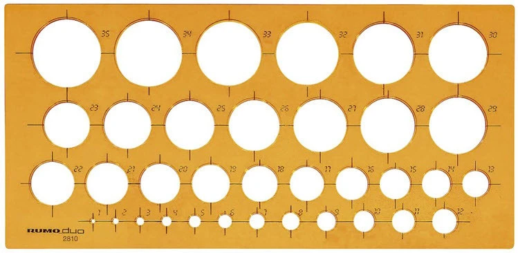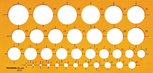 Mit der Kreisschablone von RUMOLD können Sie 35 verschieden grosse Kreise in den Grössen von 1 mm bis 35 mm (in 1-mm-Schritten grösser) zeichnen. 270 x 130 x 2 mm