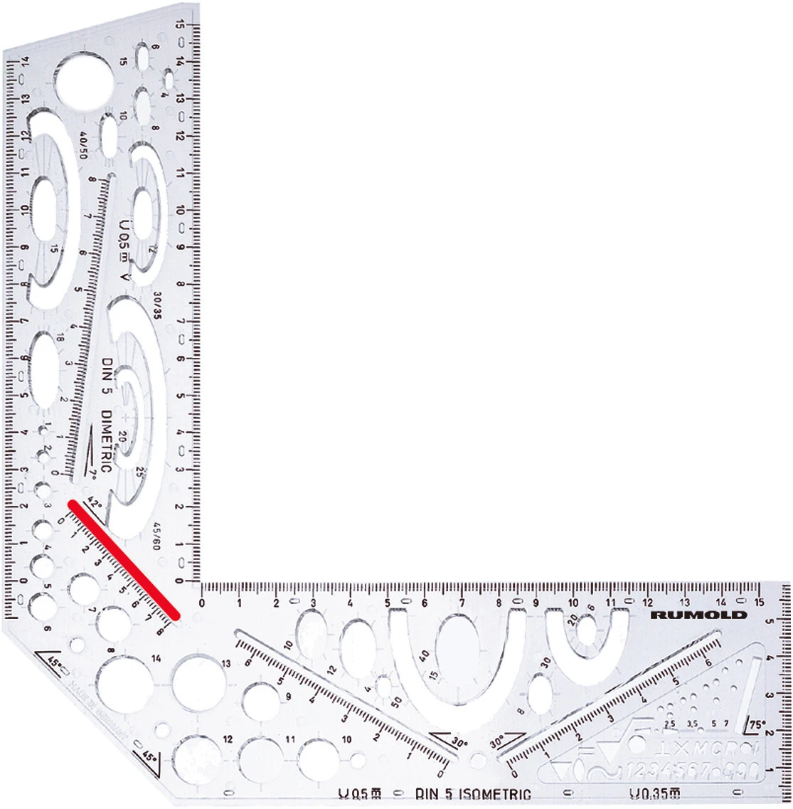Perspektiv-Eck aus unzerbrechlichem Makrolon®. Schablone mit abnehmbarem Haltegriff für das perspektivische Zeichnen im Ausbildungsbereich nach DIN ISO 5456-3. Für die isometrische Projektion 30º/30º mit Ellipsen von 4 - 50 mm, die dimetrische Projektion 7º/42º mit Ellipsen von 4 - 60 mm und die Kavaliersperspektive 0º/45º. Kreise von 1 - 15 mm Ø. Oberflächenzeichen und Hilfslinien für Normschrift ISO / DIN 2,5 , 3,5 , 5 und 7 mm. Mit umlaufender Tuschekante und Tuschenoppen.