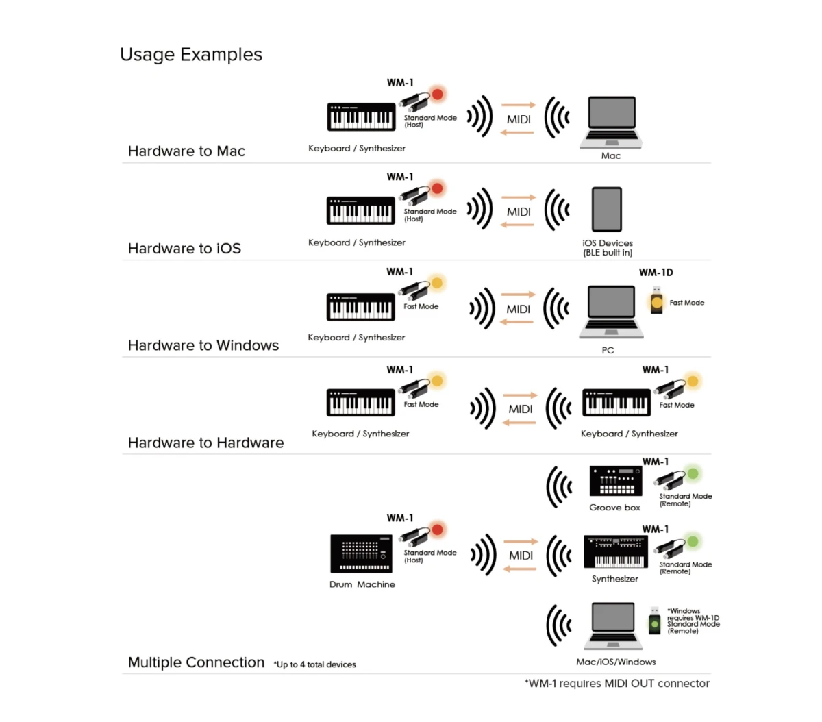 Als Windows-Anwender ist der WM-1D die richtige Wahl, um dein Setup mit kabellosem MIDI aufzuwerten. Verbinde diesen einfach mit einem freien USB-Port deines Computers und erlebe die reaktionsschnelle Kommunikation mit jedem Instrument oder Gerät, das mit einem WM-1/WM-1D verbunden ist, sowie mit iOS-Geräten und Mac-Computern via Bluetooth MIDI. Neben MIDI-Noten kannst du Tempo-Sync-Daten, Effekte, LFOs, Loops und mehr über MIDI senden – ohne ein einziges Kabel anzuschließen. iOS-Geräte und Mac-Computer kommunizieren im Standard-Modus mit der WM-Serie über Bluetooth. Für Situationen, in denen du die maximale Übertragungsgeschwindigkeit benötigst, hilft dir der WM-1D weiter.