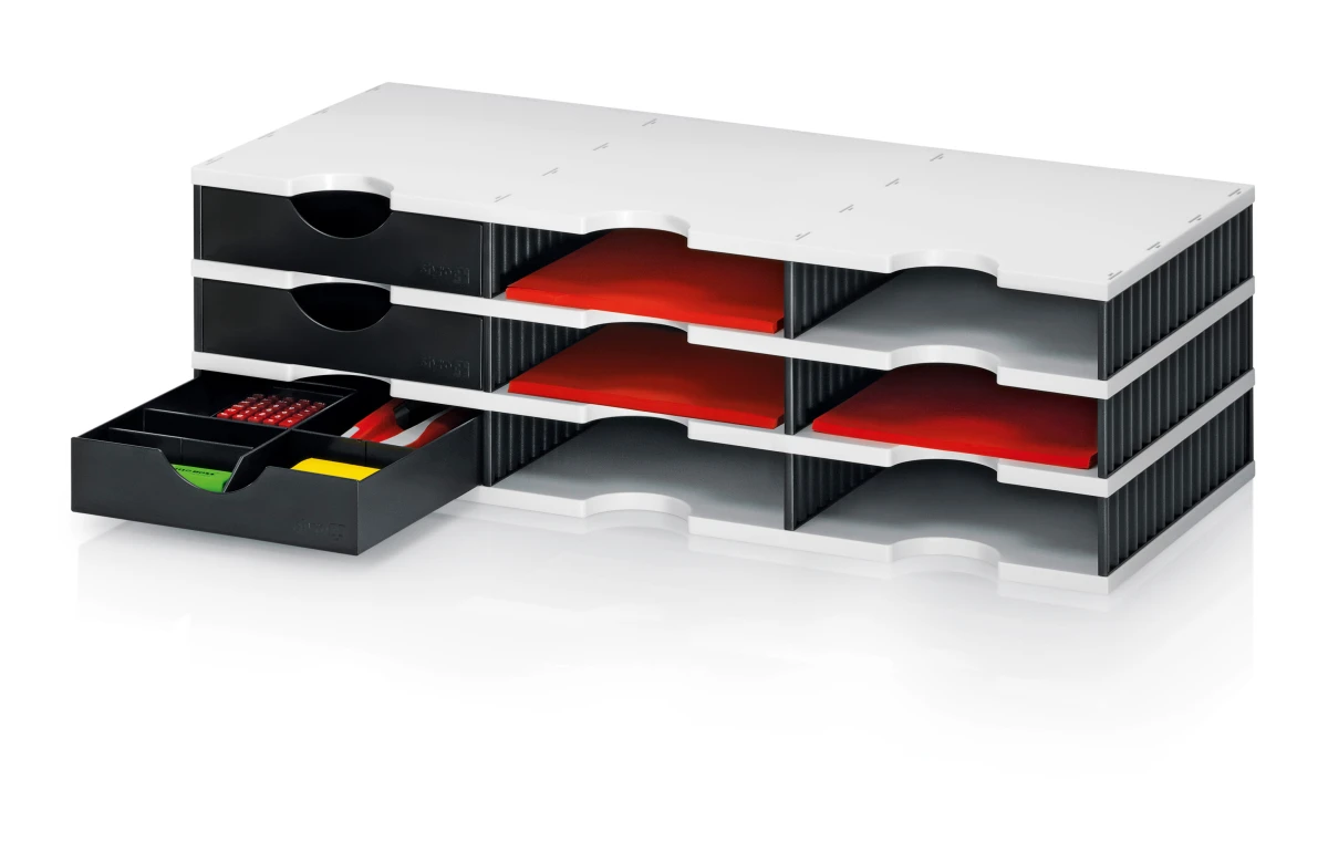 - STYRODOC trio SET mit 9 Fächer, 3 System-Schubladen und Unterteilung-Set