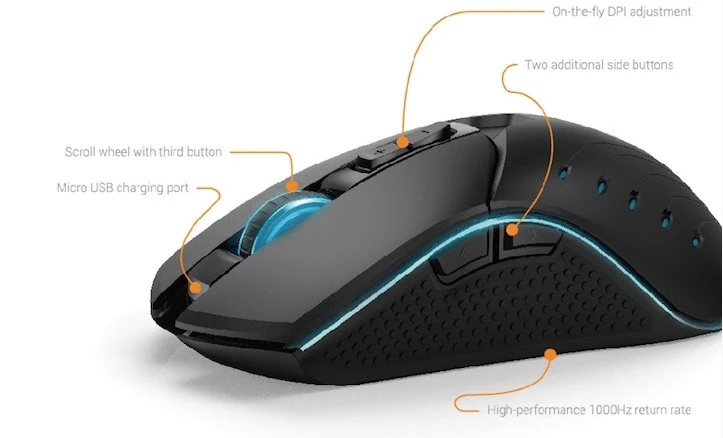 Die hochauflösende und kabellose Edge 2.0 Gaming Maus mit 3500 dpi und 1000 Hz Polling Rate wurde für Gamer als auch für den professionellen Einsatz bei der höchste Präzision ein Muss ist, entworfen. Die natürliche Formgebung des Edge schmiegt sich Ihren Fingern und Ihrem Daumen an, damit die Maus auch bei längerer Verwendung bequem in der Hand liegt und Belastungen verhindert werden. 6 verschiedene LED Farben beleuchten die Maus je nach DPI Auflösung. Die DPI Auflösung kann per einfachen Knopfdruck gewechselt werden (500/1000/1500/2000/2500/3500 DPI). Bei jeder Auflösung scheint die Maus in einer anderen Farbe. Eine Taste an der Unterseite schaltet die LED Leuchte aus, um Ablenkungen während des Gebrauchs zu vermeiden. Nach einer 5-minütigen Ruhephase geht die Maus in den Standby-Modus über um die Batterie zu schonen. Die Edge 2.0 kann bequem und umweltschonend über den Micro USB Port aufgeladen werden.