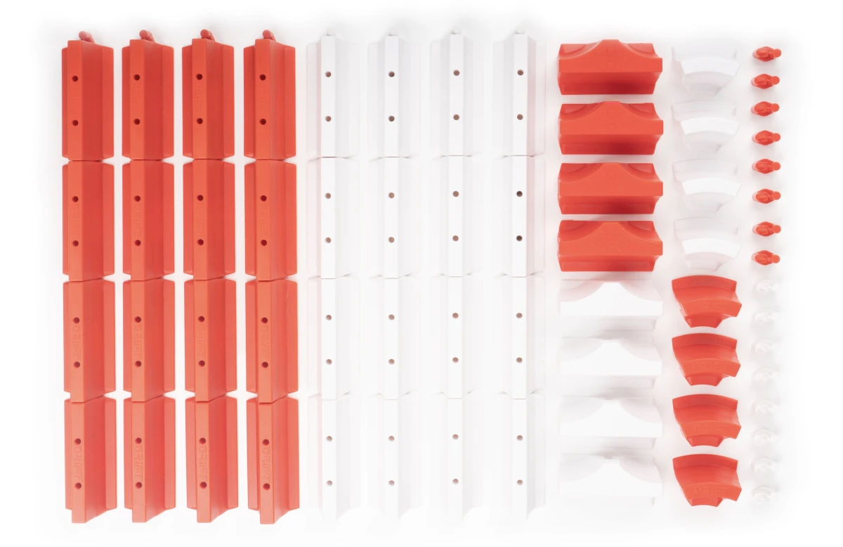 Diese Streckenbegrenzungen lassen sich durch ihre beiden unterschiedlichen Rastpositionen kinderleicht sowohl zu Geraden als auch zu Kurven zusammenstecken, damit Du Deiner Fantasie freien Lauf lassen kannst. Ihre besondere Form erleichtert zudem das Wegfahren nach einer Kollision. Du kannst die Begrenzungen auf fast jedem ebenen Untergrund verwenden. Die Elemente wurden speziell für die Verwendung mit DR!FT Rennstrecken entwickelt und halten dank ihrer Haftpads auf dem DR!FT Hafen Dock und dem Racetrack DR!FT Land Kollisionen stand, ohne zu verrutschen. Einfach hinstellen und losdriften. 16x Gerade Rot, 16x Gerade Weiß, 4x Kurve Rot, 4x Kurve Weiß, 4x T-Stück Rot, 4x T-Stück Weiß, 8x Connector Rot, 8x Connector Weiß.