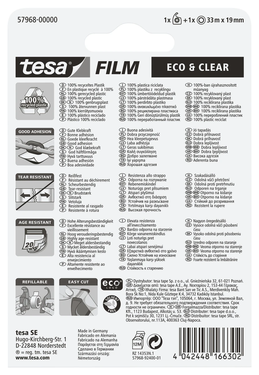 Der verlässliche tesafilm ist auch als recycelte, umweltfreundliche Variante erhältlich: 100 % Qualität + 100 % recycelter Kunststoff!