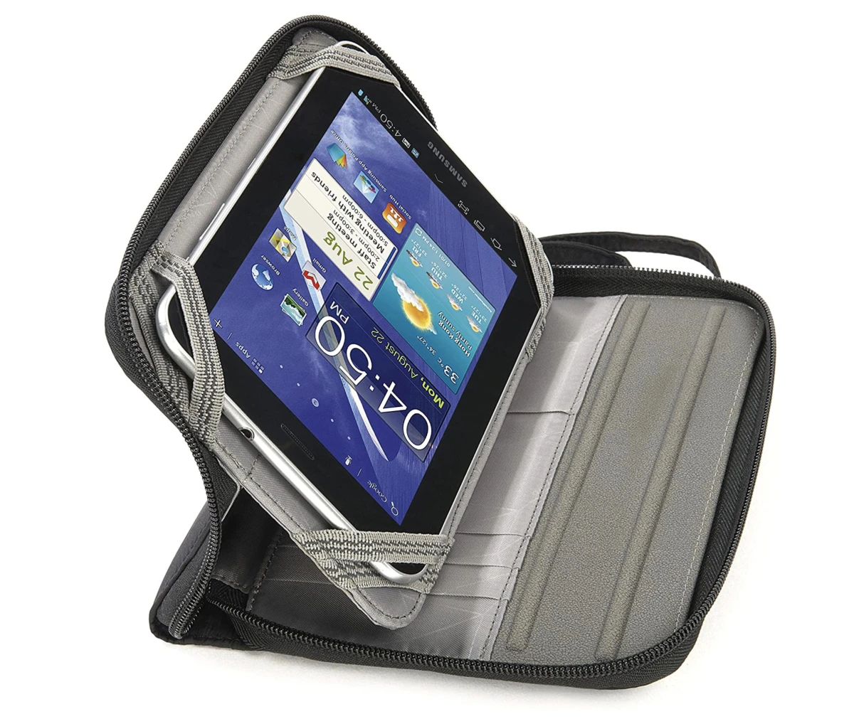 Gepolstertes und geschmeidiges Case aus stabilen Nylon mit integrierten, variablen Stand in mehreren Schreibpositionen für 7" Tablets. Fixierung der Geräte innen mittels stabilem Gummizug. Reißverschlussfach für Zubehör an der Außenseite. Stabile und praktische Trageschlaufe für sicheren Halt. Weiches Innenfutter aus Microfaser pflegt und schützt vor Kratzern. Steckfächer für Notizen, Karten und Zubehör. Beiliegend Microfaserpad zum Polieren des Displays.
